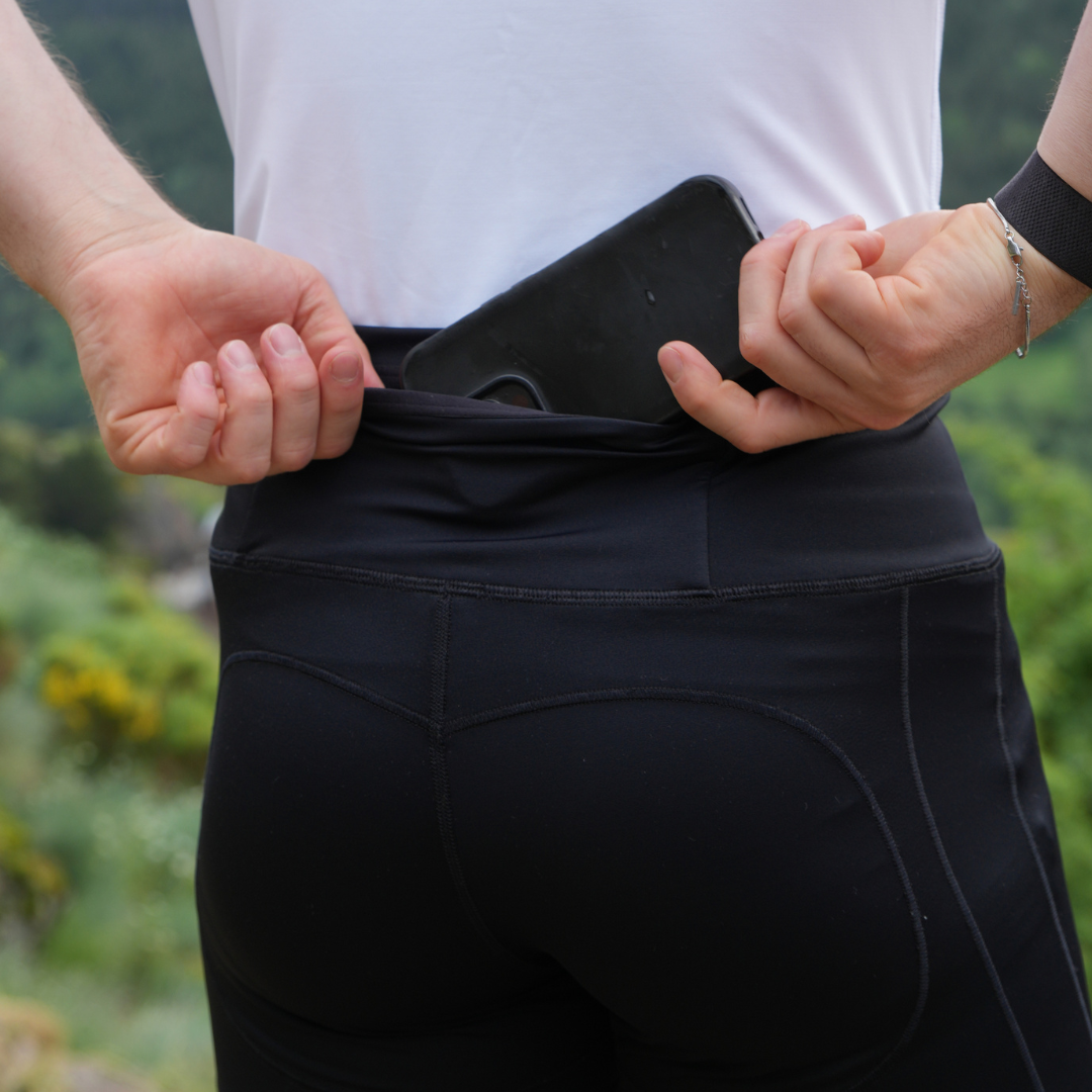 Dank des integrierten Gürtels können Sie Ihre wichtigsten Dinge wie Gels, Handy oder Trinkflaschen ohne Tasche oder sperriges Armband mitnehmen .